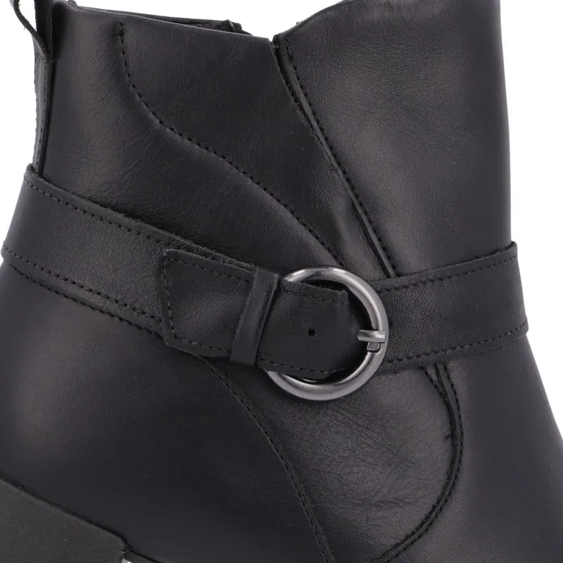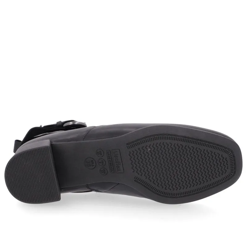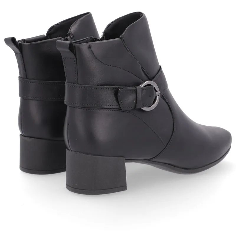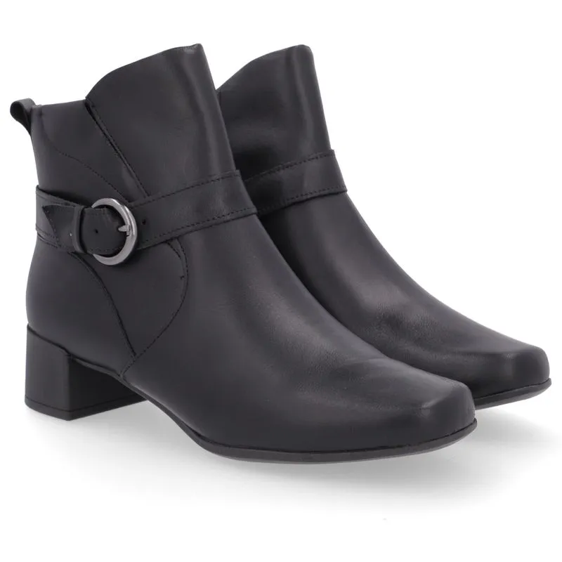 Bota salto bloco cabedal em couro napa na cor preto fechamento zíper. O modelo possui tecnologia +Bem-Estar, com espumas posicionadas em pontos estratégicos na palmilha garantindo conforto e suavidade na pisada.