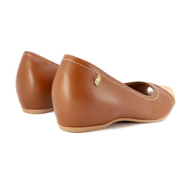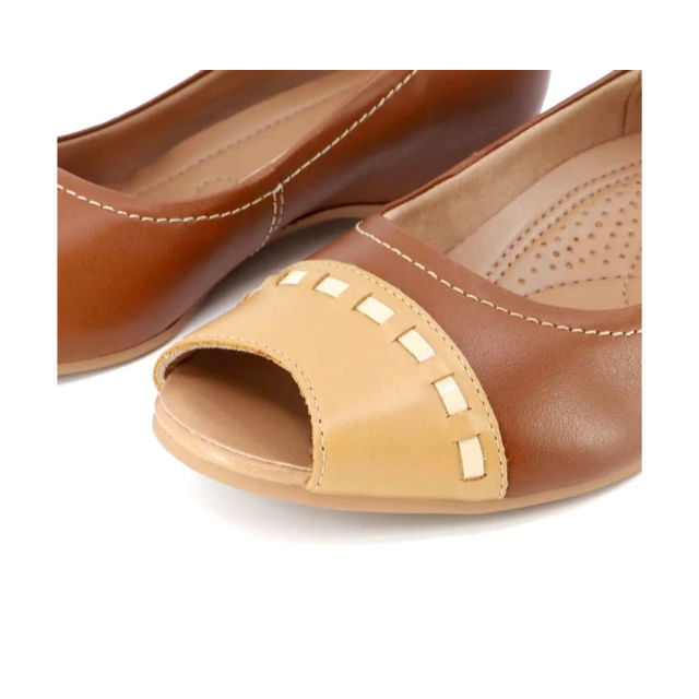 Peep toe salto embutido cabedal em couro vegetal nas cores amêndoa e canela detalhe em tressê. O modelo possui tecnologia Memória Permanente, com material de capacidade de retorno e mantêm o formato dos seus pés na palmilha.