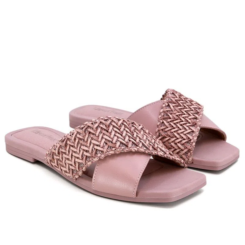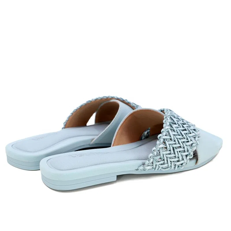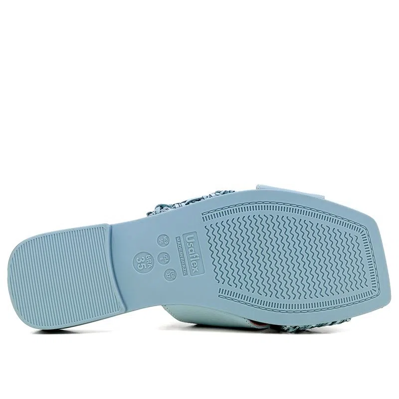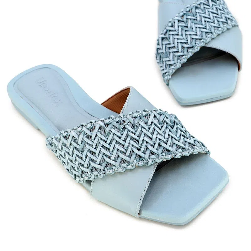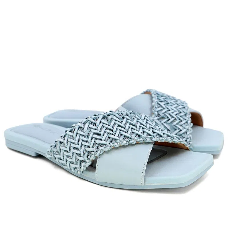 Tamanco rasteira, cabedal em couro vegetal na cor oceano com detalhe tira trançada. O modelo possui tecnologia Antibacteriano, com forro que reduz a propagação de fungos e bactérias.