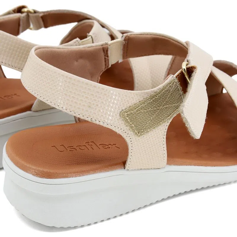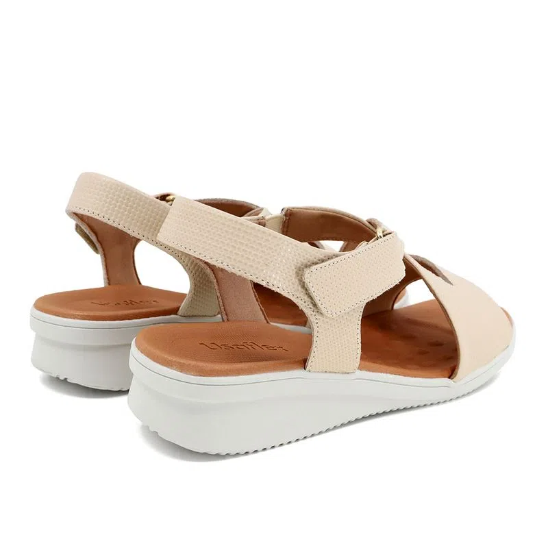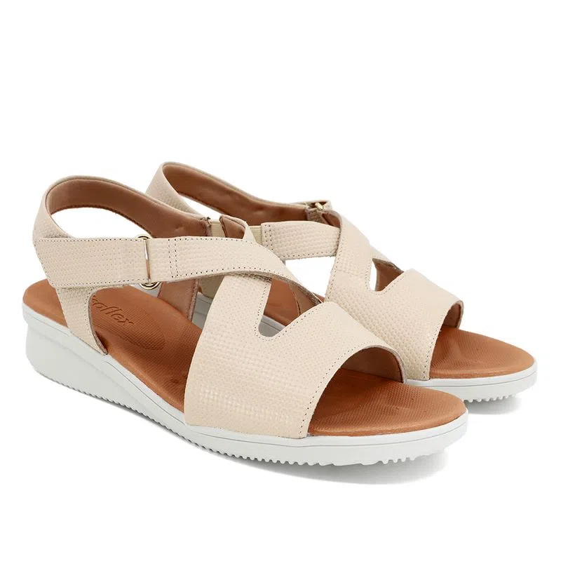 Sandália em couro mini tressê na cor vanilla com fechamento em fecho-flex. O modelo possui tecnologia Sola+Conforto, um solado com es pessura extra que reduz o impacto das irregularidades do solo.
