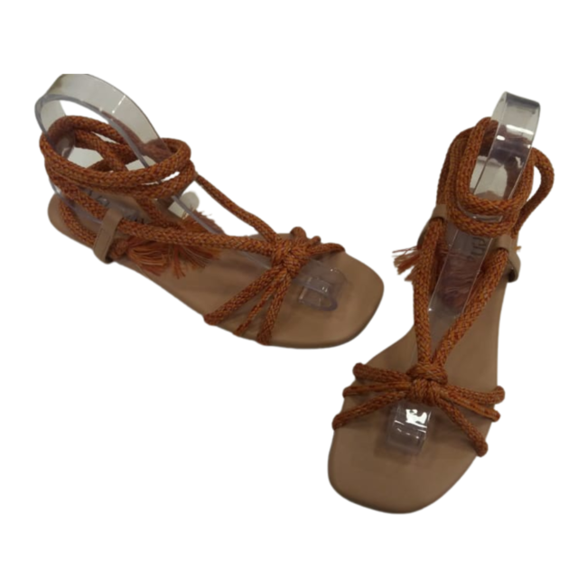 Sandália de amarração Valentina Flats, ela traz tiras em corda colorida sobre os dedos e mais tiras conectada a essas, que sobe e cruza o peito do pé e fecha em amarração superior. Deixa todo o pé à mostra. A amarração valoriza as pernas e favorece peças em comprimentos midi e curtos. Must have!