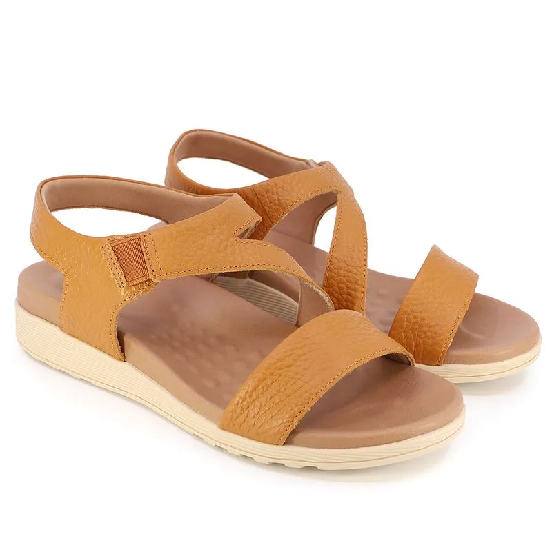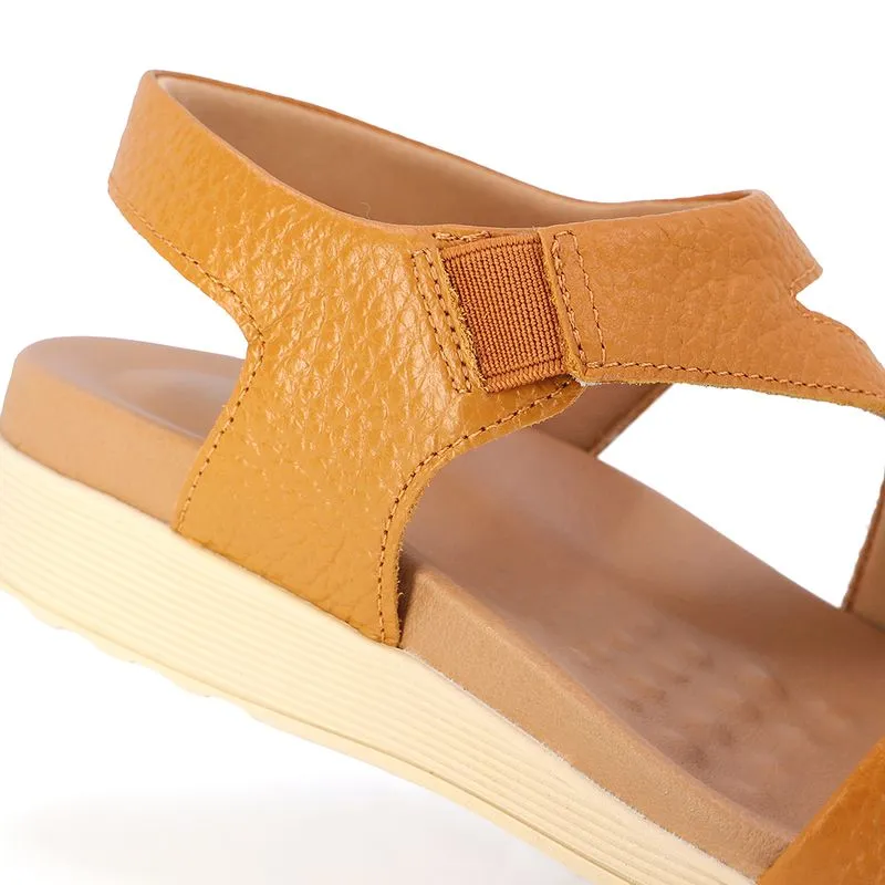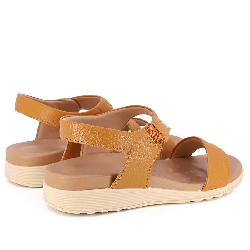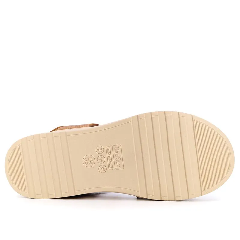 Sandália plataforma com cabedal em couro relax catalano na cor tan. O modelo possui tecnologia Calce Fácil, com modelagem inteligente em adaptar o calçado a ergonomia dos pés.