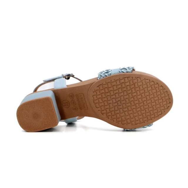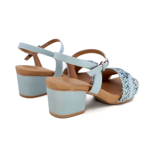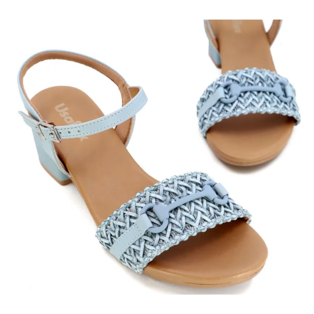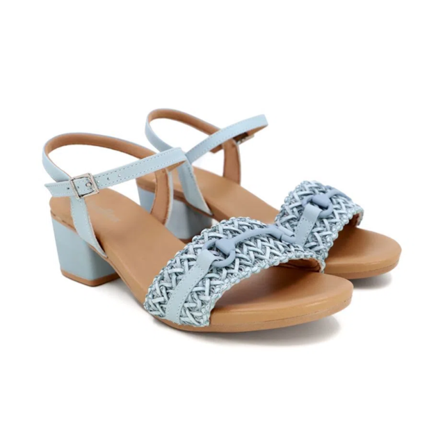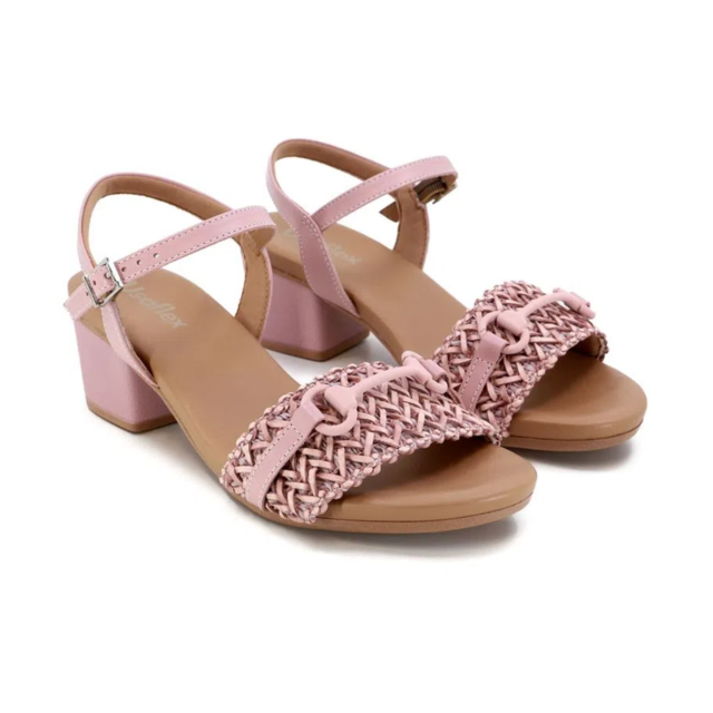 Sandália salto bloco, cabedal em tira trançada e vegetal, fechamento em fivela e detalhe de enfeite. O modelo possui tecnologia Antibacteriano, com forro que reduz a propagação de fungos e bactérias.