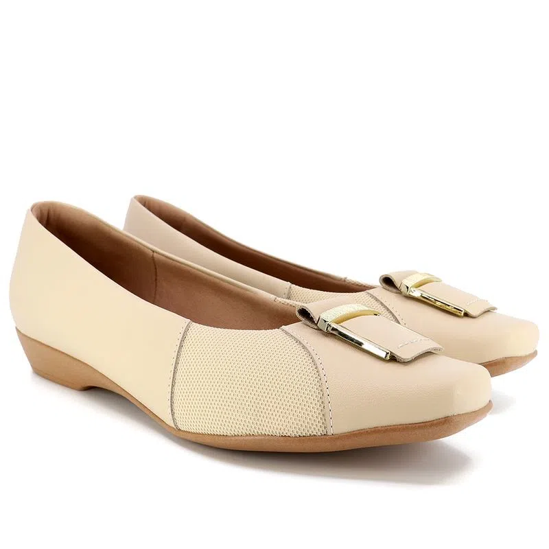 Sapatilha cabedal em couro napa valise e tecido fawo na cor vanilla detalhe em enfeite. O modelo possui tecnologia Joanetes, que alivia o desconforto da região, garantindo suavidade na pisada por usufruir de materiais moldáveis nos pés.