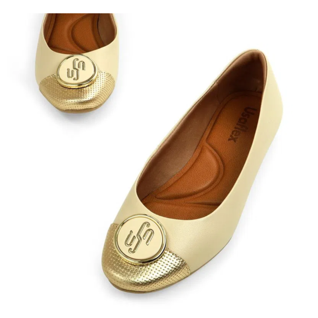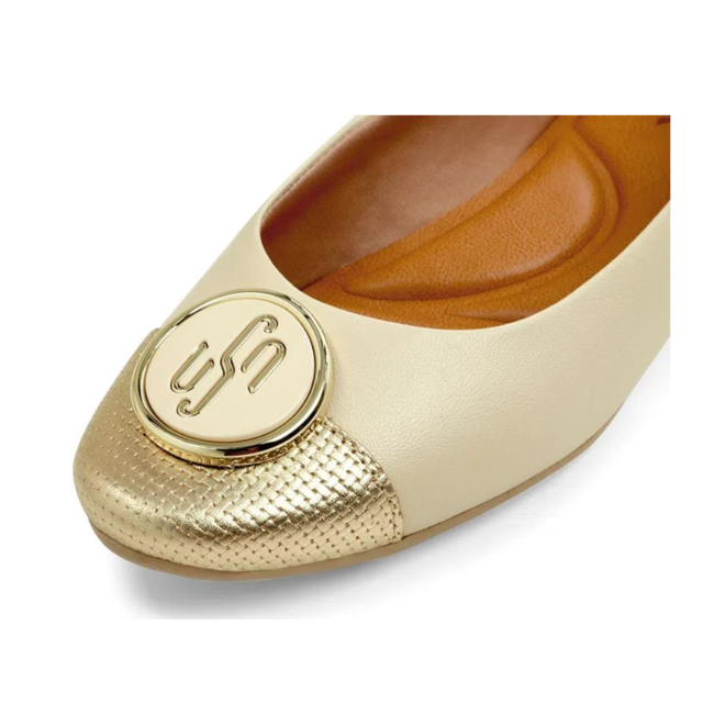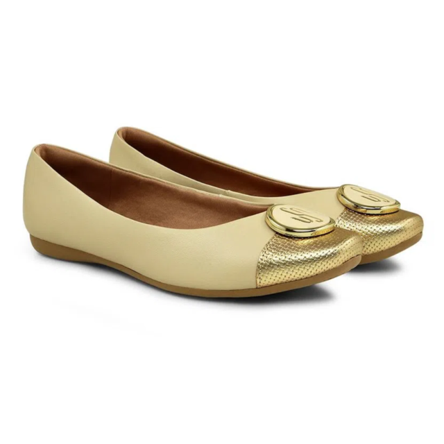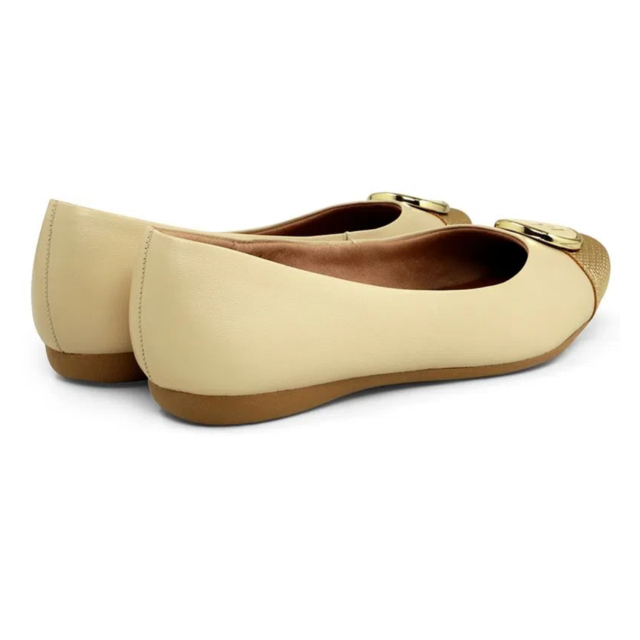 Sapatilha bicolor em mini tresse prata velha e couro liso vanilla com enfeite. O modelo possui tecnologia +Bem-Estar, que garante conforto e suavidade na pisada por mais tempo.