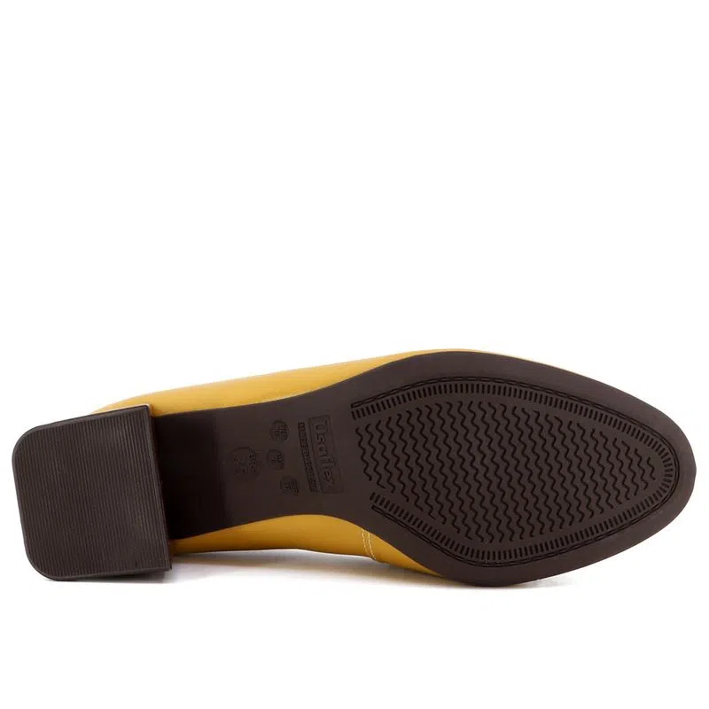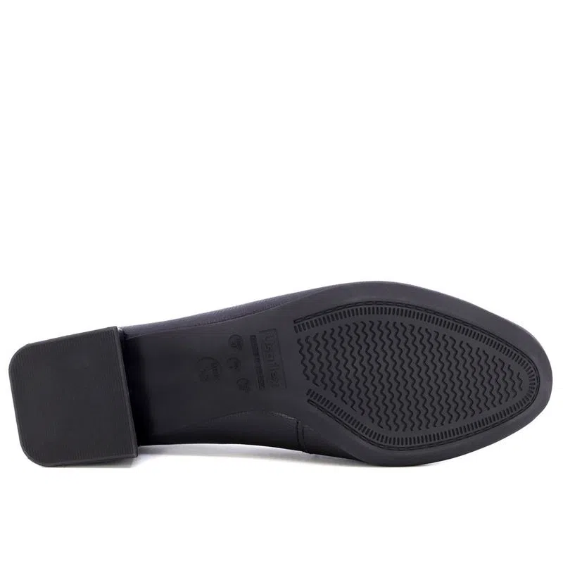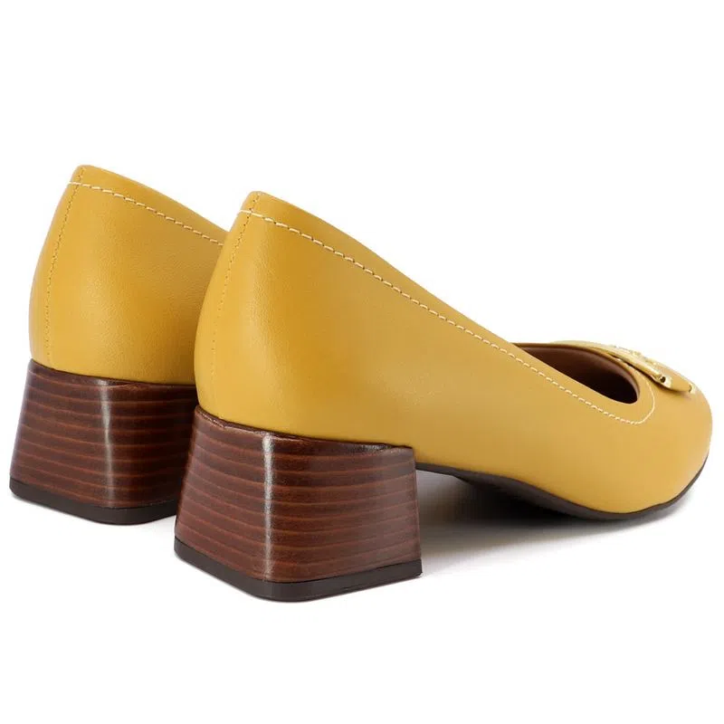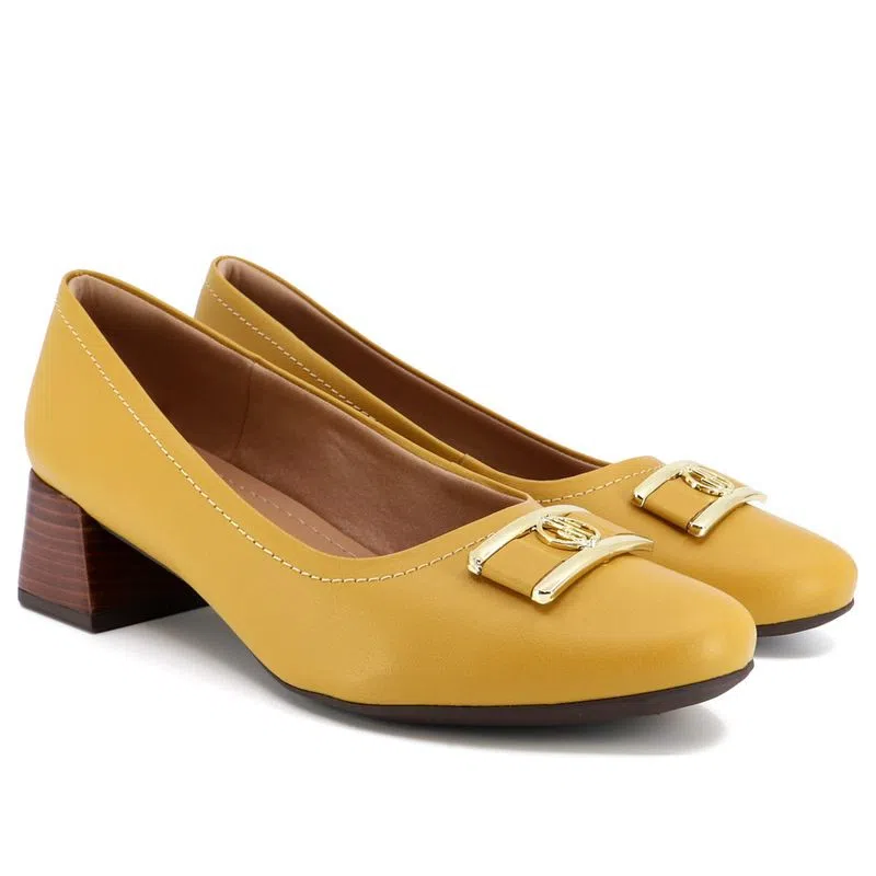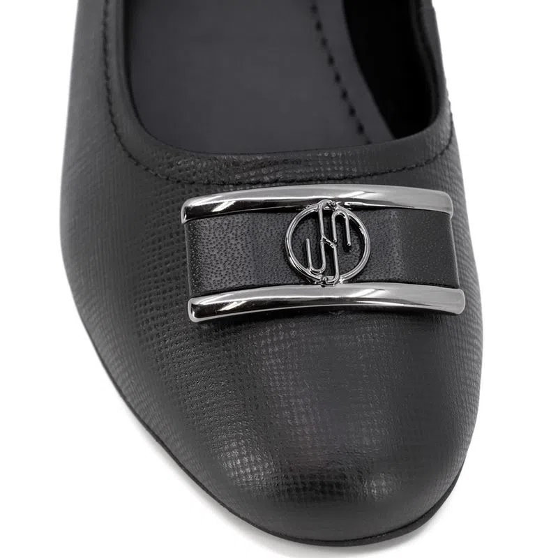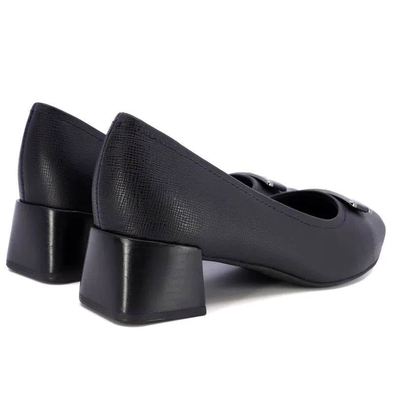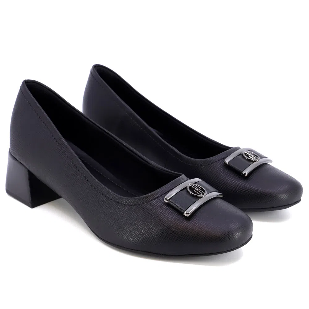 Scarpin salto bloco em couro safiano com detalhe de enfeite. O modelo possui tecnologia Memória Permanente, com material de capacidade de retorno e mantêm o formato dos seus pés na palmilha.