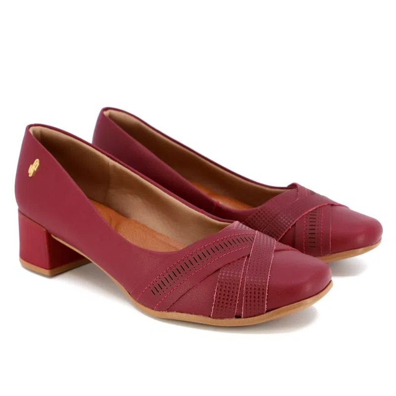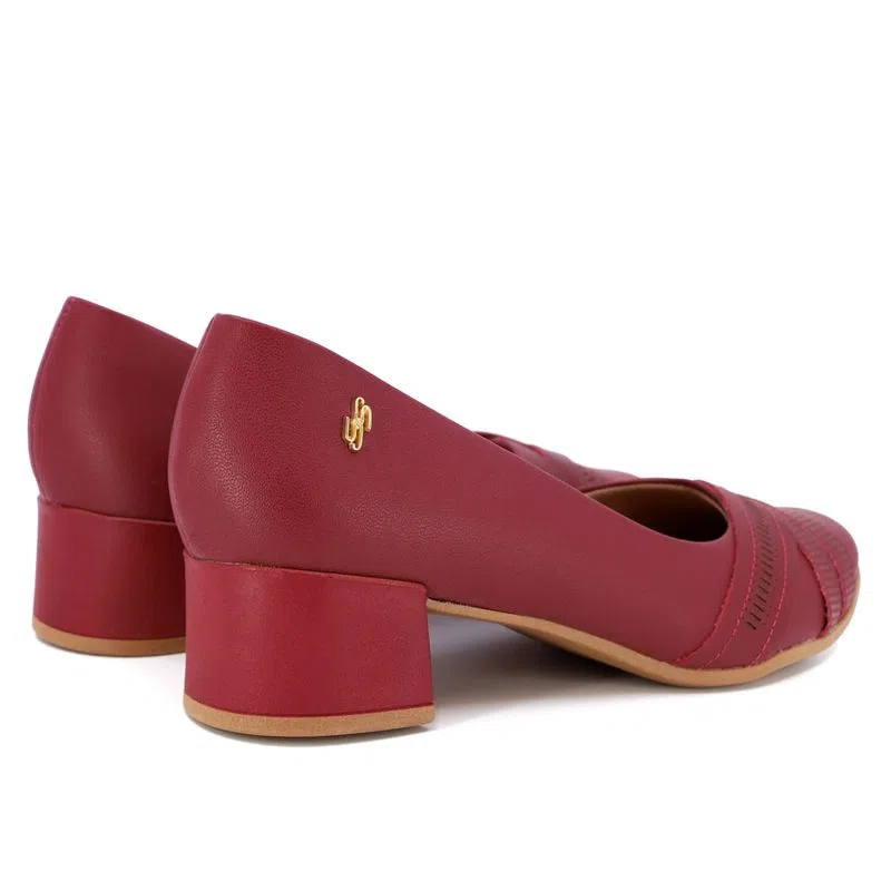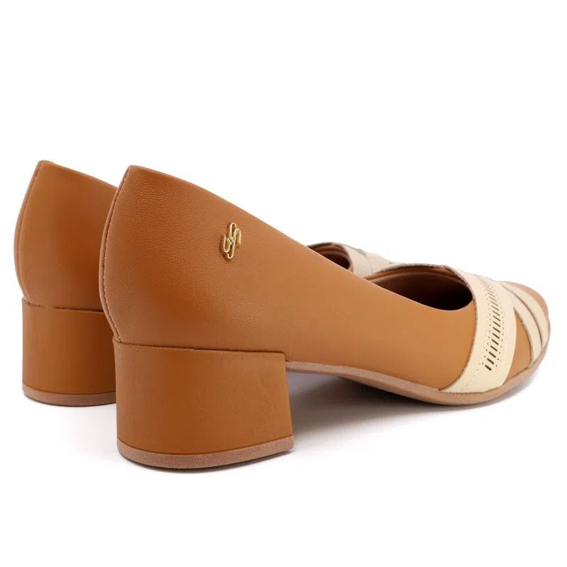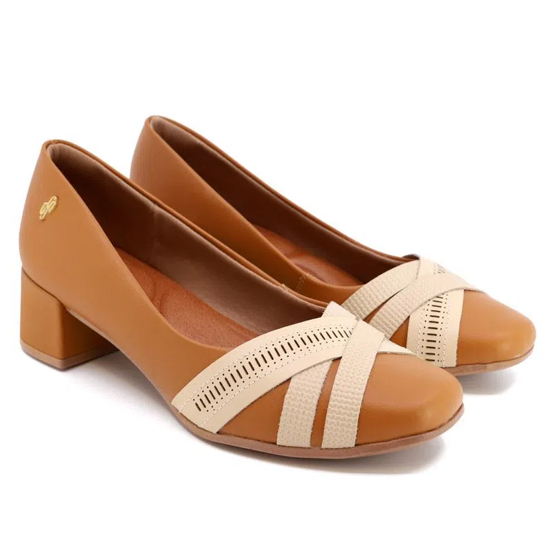 Scarpin salto bloco em couro napa valise e mini tresse nas cores tan e vanilla com detalhe laser. O modelo possui tecnologia +Bem-Estar, com espumas posicionadas em pontos estratégicos na palmilha garantindo conforto e suavidade na pisada.