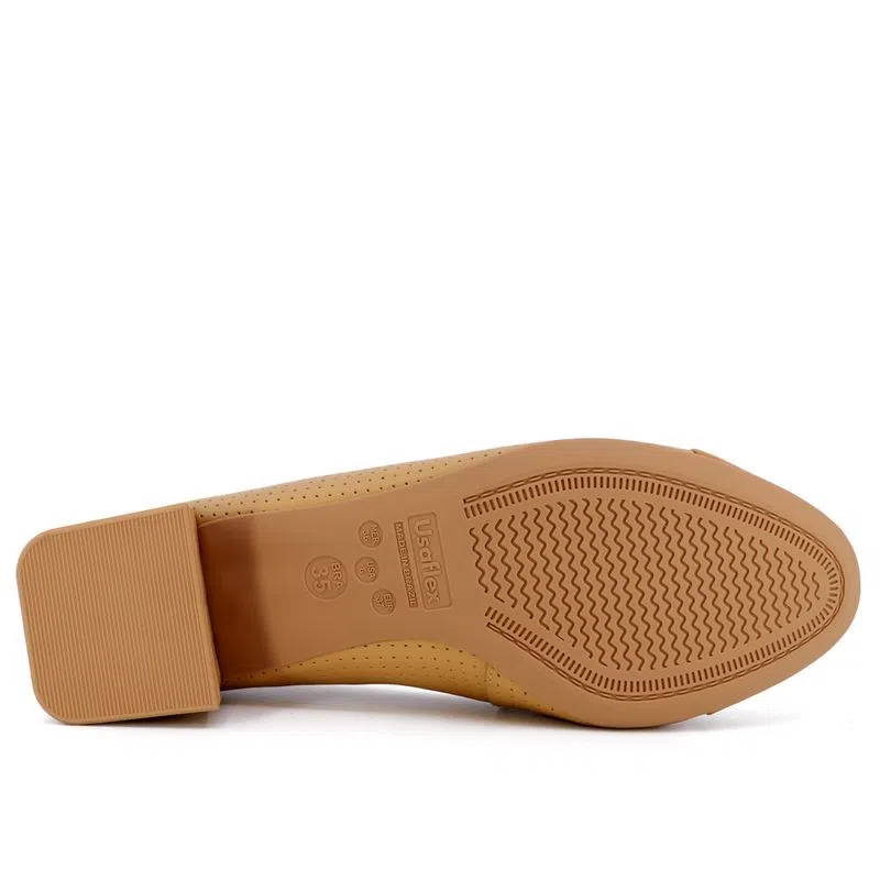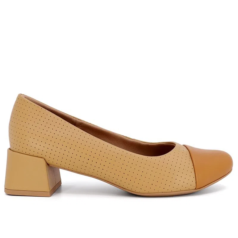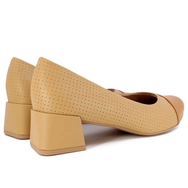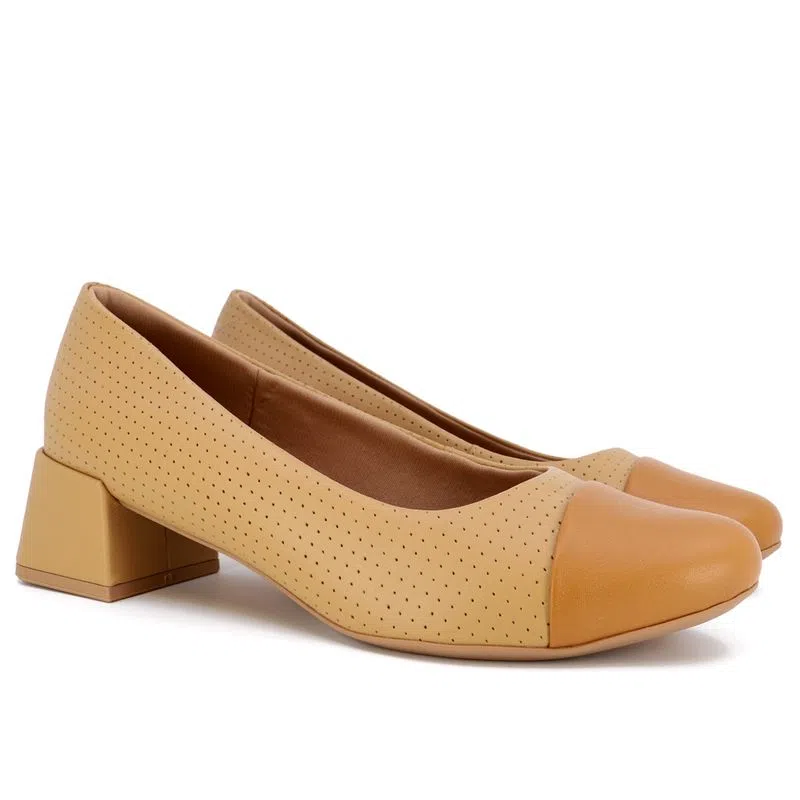 Scarpin salto bloco em couro napa valise nas cores tan e amêndoa com detalhe em estampa. O modelo possui tecnologia Memória Permanente, com material de capacidade de retorno e mantêm o formato dos seus pés na palmilha.