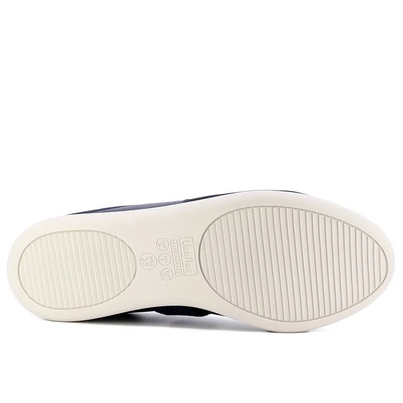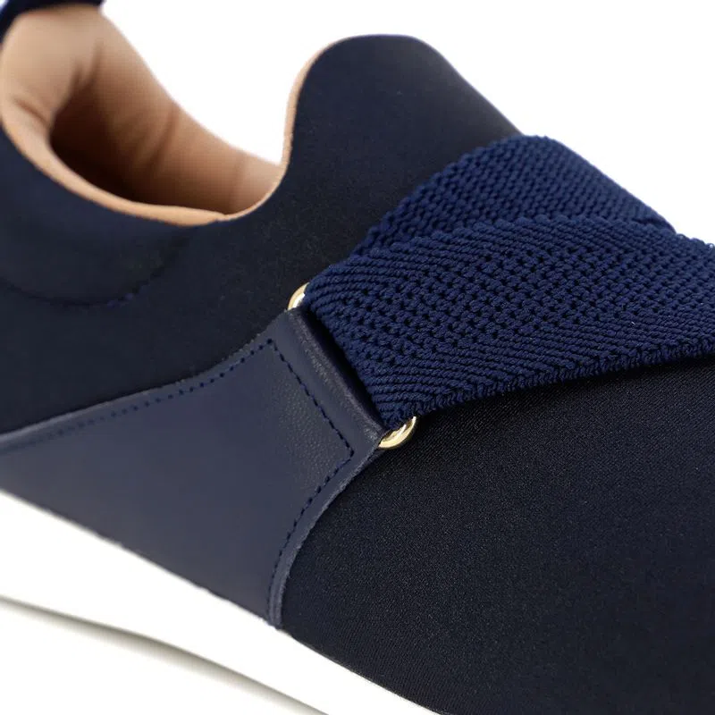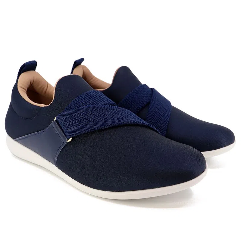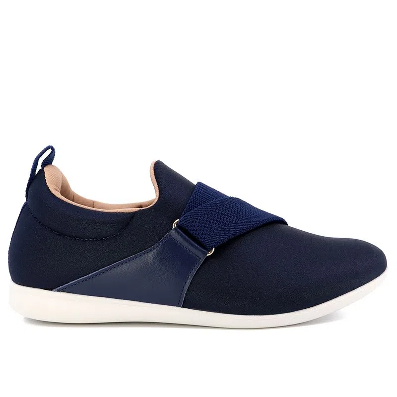 Tênis cabedal em tecido elástano e couro napa valise na cor new blue, detalhe em elástico. O modelo possui tecnologia Calce Fácil, com modelagem inteligente em adaptar o calçado a ergonomia dos pés.