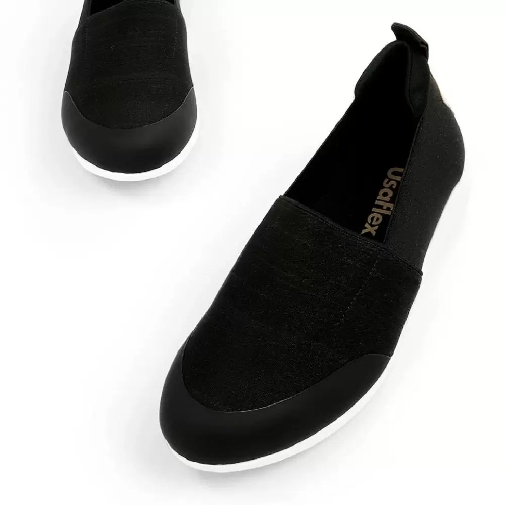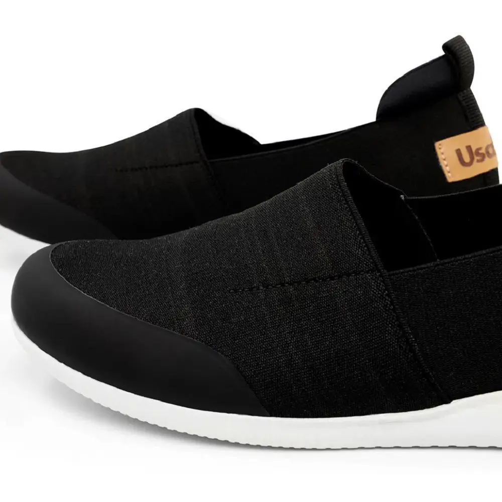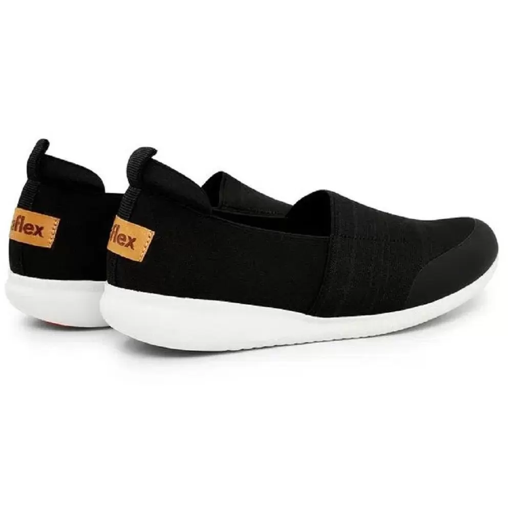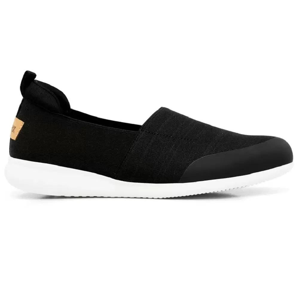 Tênis slip on em elástico preto com biqueira preto. O modelo possui tecnologia Amortecedor e Calce Fácil, diminuindo o impacto ao caminhar e design facilitado em adaptar o calçado a ergonomia dos pés. Tecnologia: Antibacteriano, Calce Fácil, +Aderência.